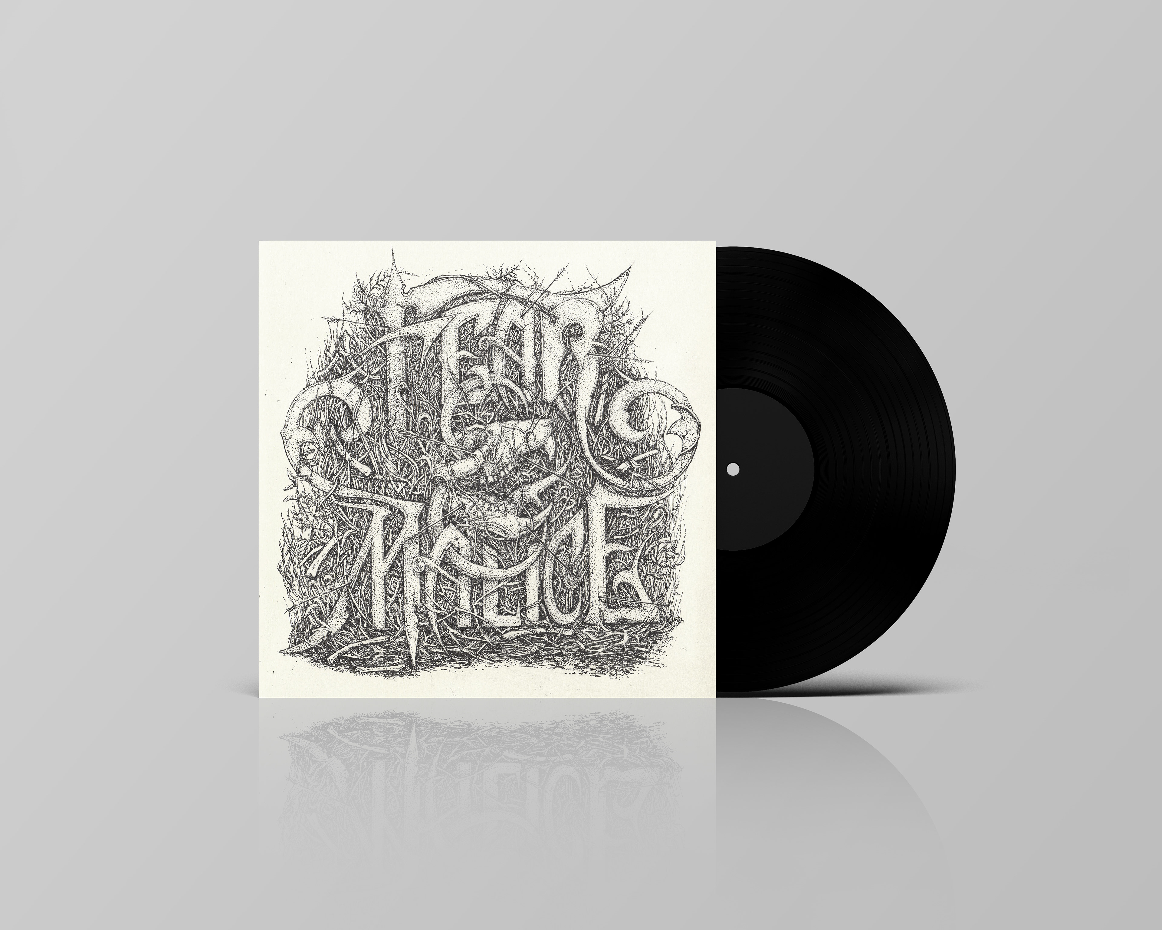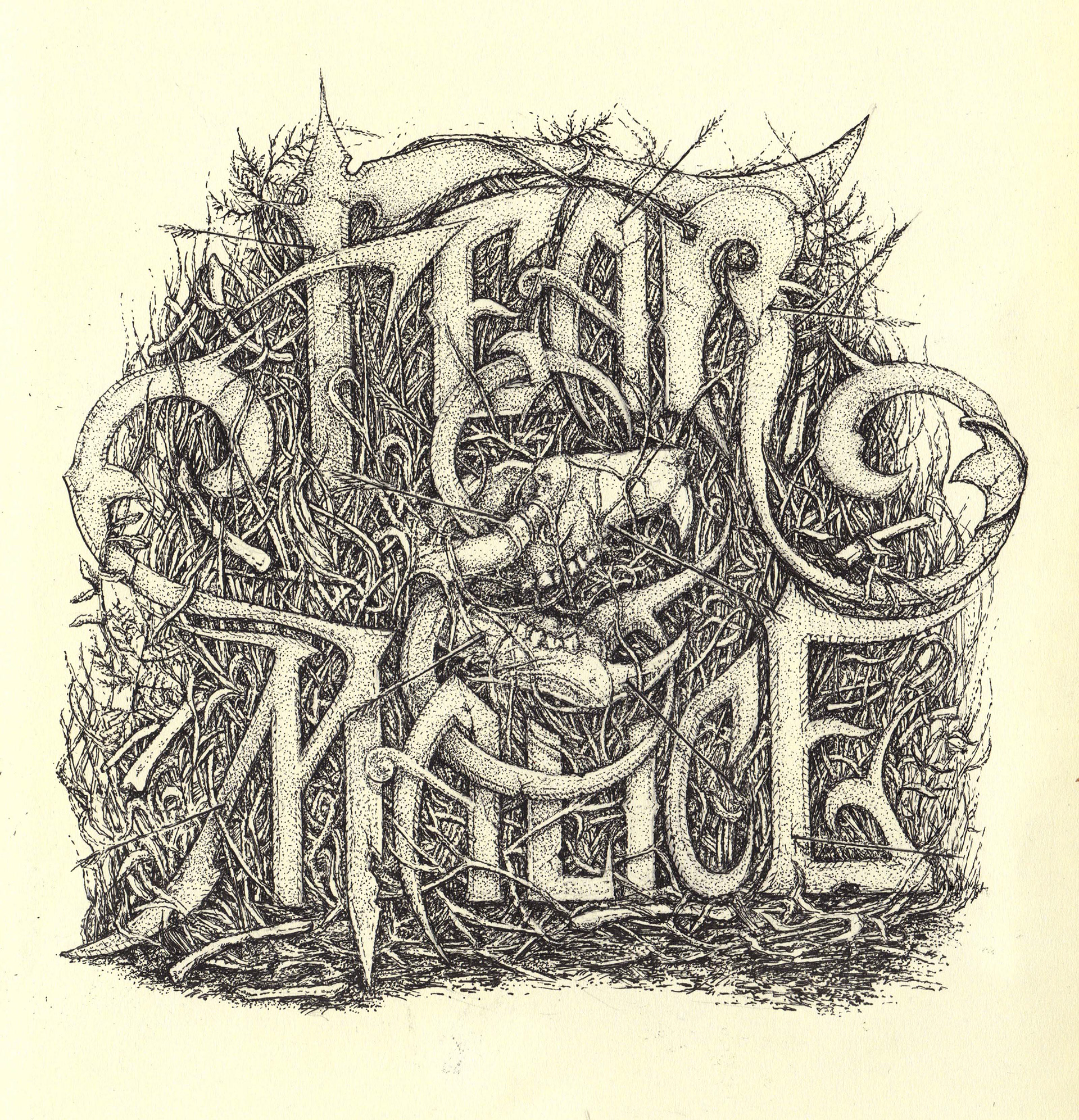 An album cover illustration for a made-up band by the name of "Fear & Malice." Words were chosen out of a hat as an illustration prompt. Originally drawn on moleskin in pen and ink; approximately 6 in x 6 in.