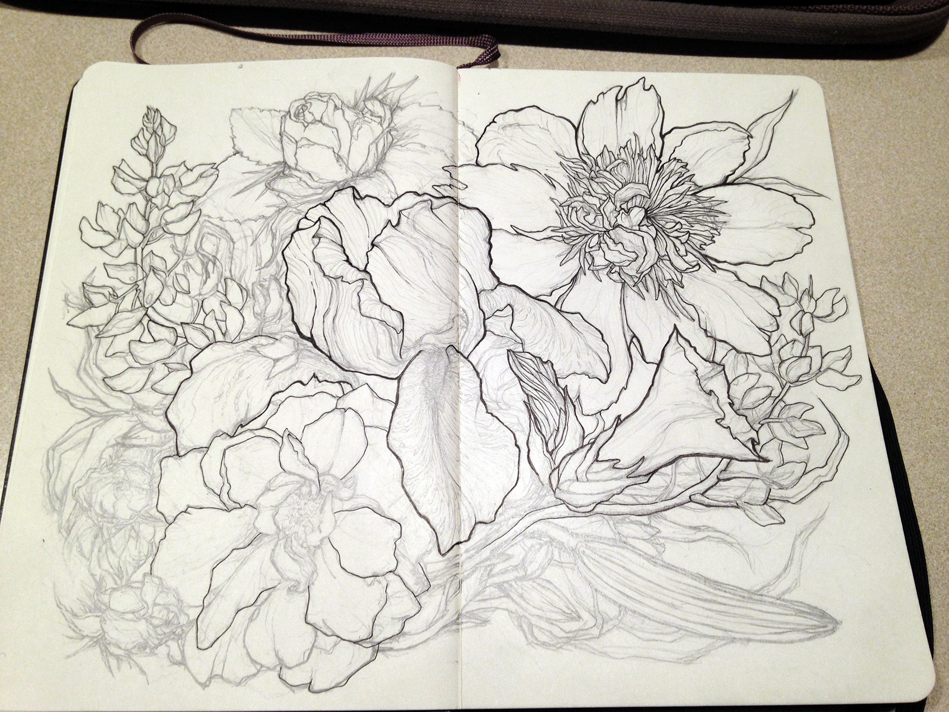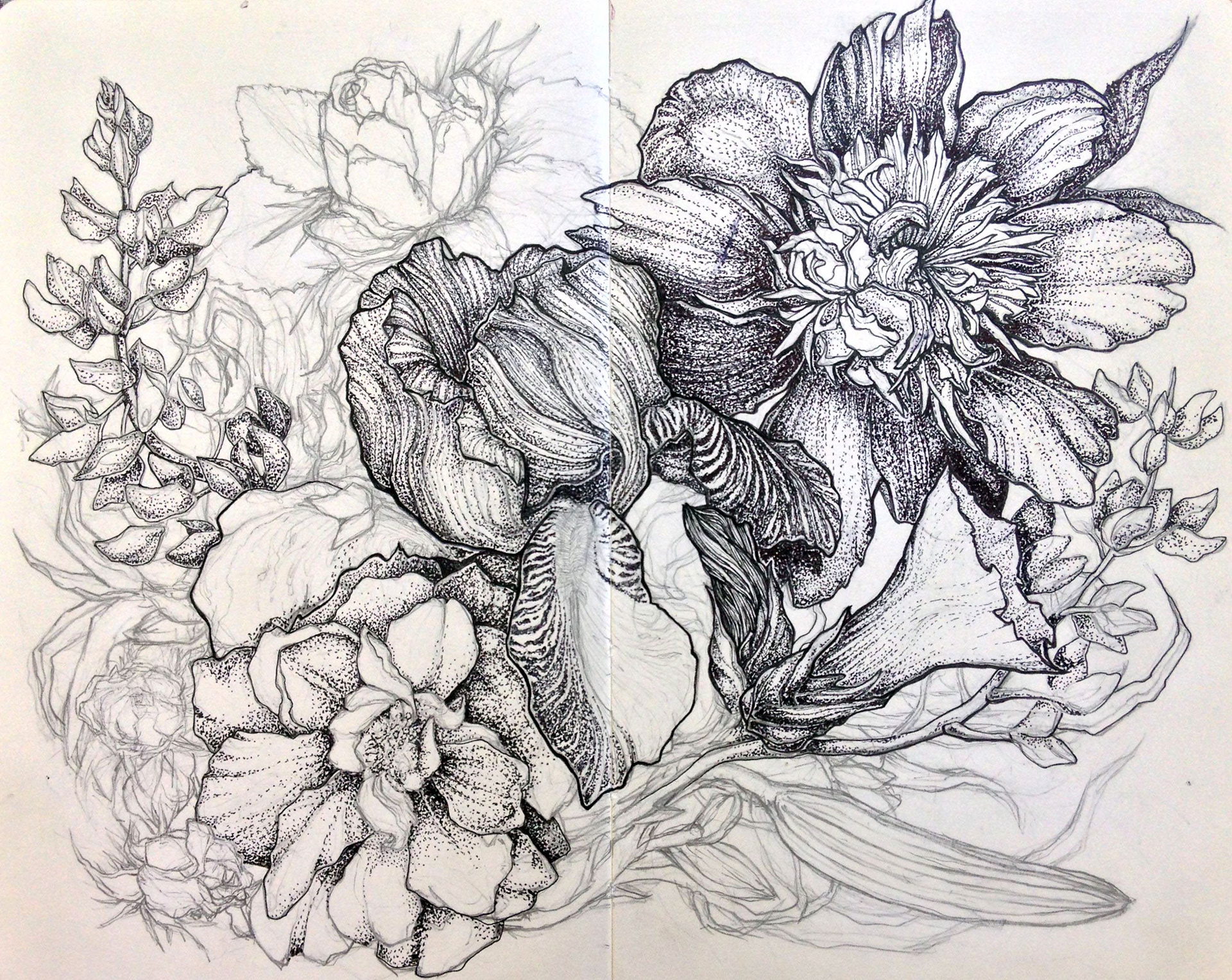 Floral sketchbook illustration spread of June flowers