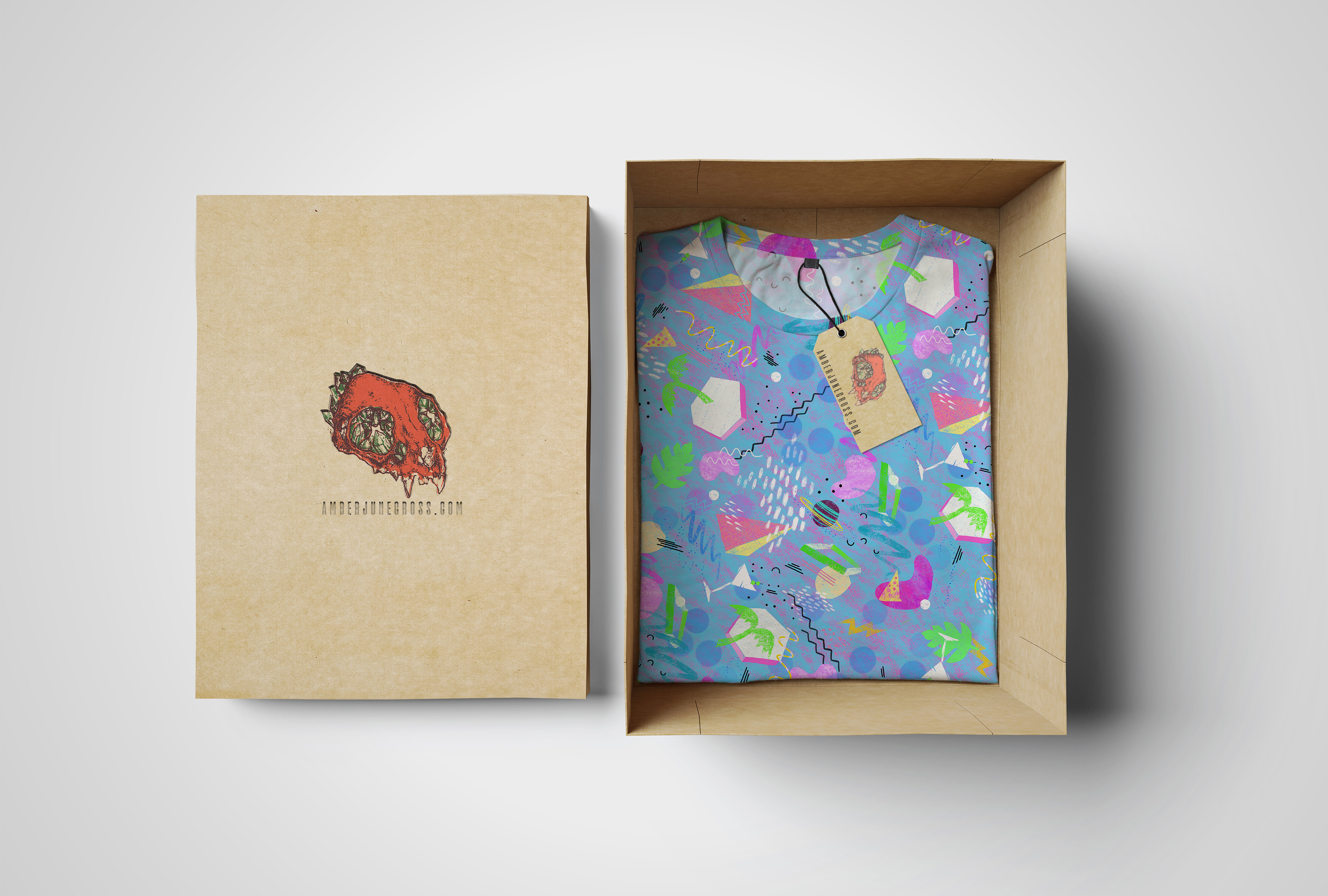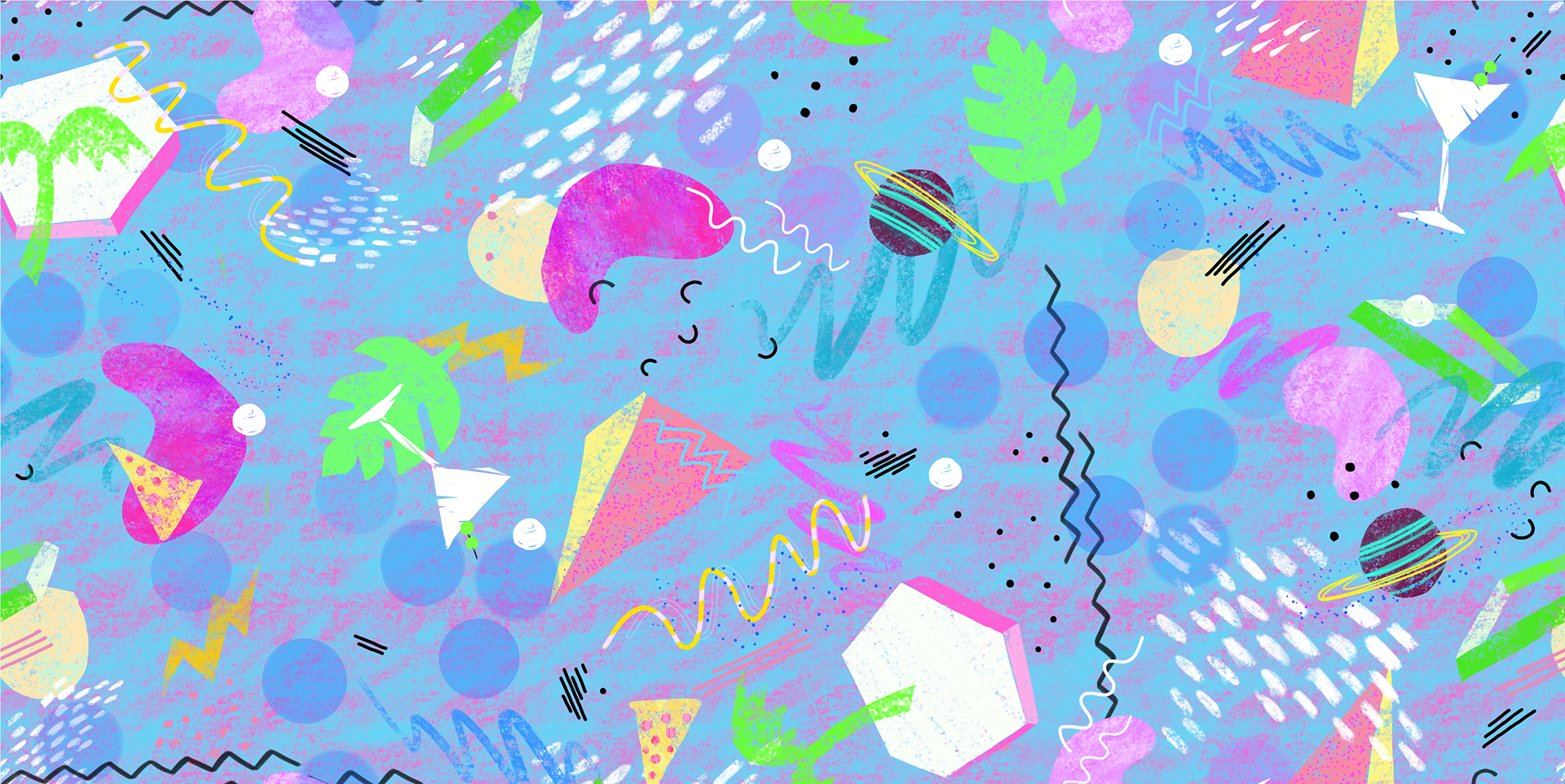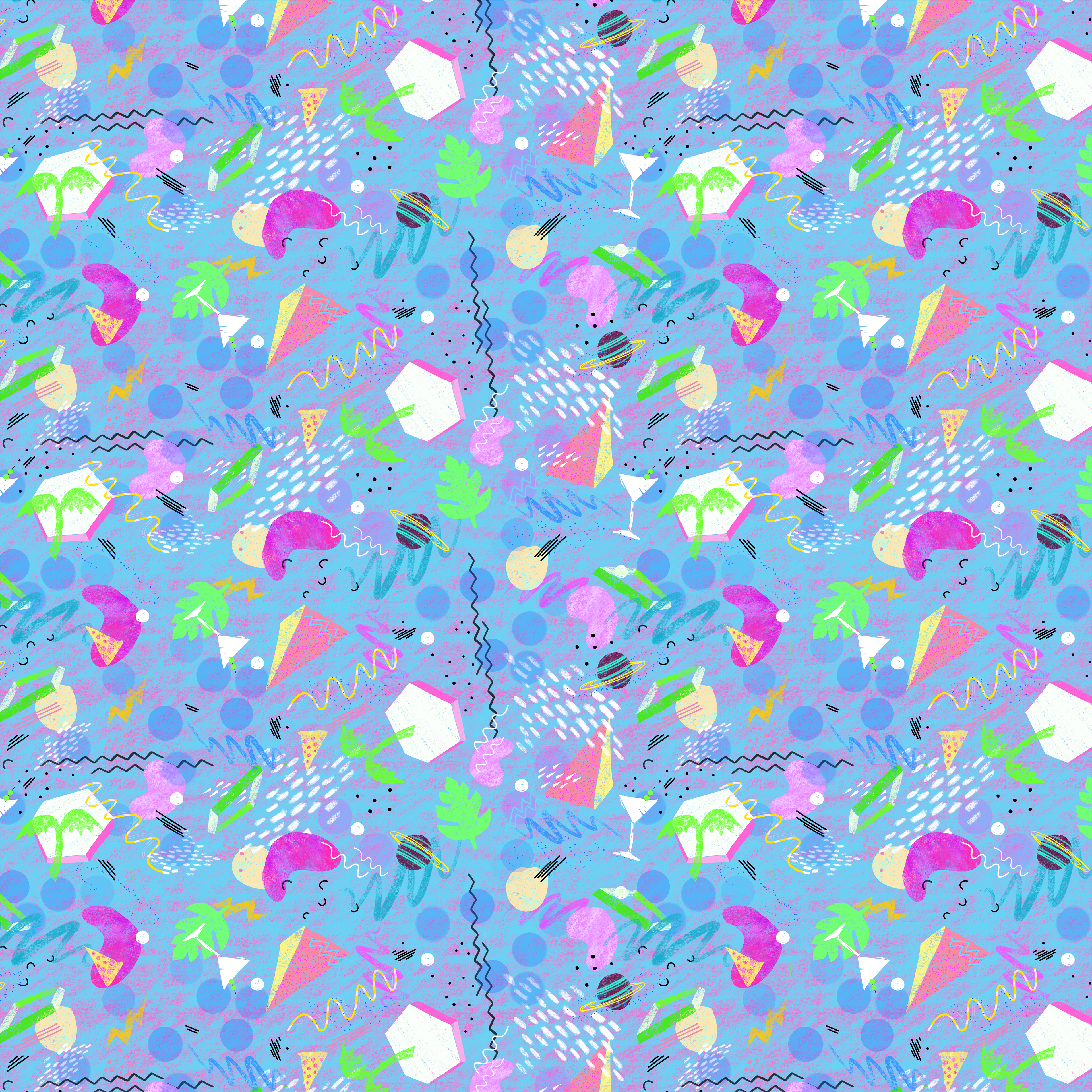 Repeat print created in Procreate for iPad. Includes palm trees, martinis floating in a Saved by the Bell-inspired background, with the occasional slice of pizza. Can you find it?