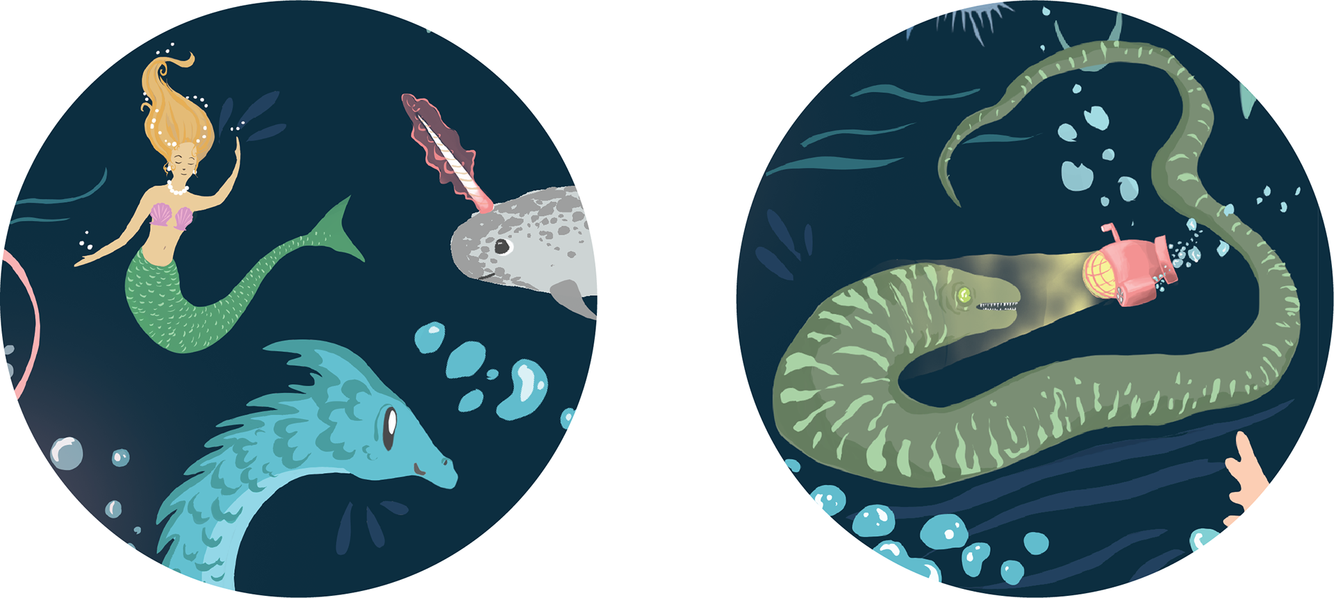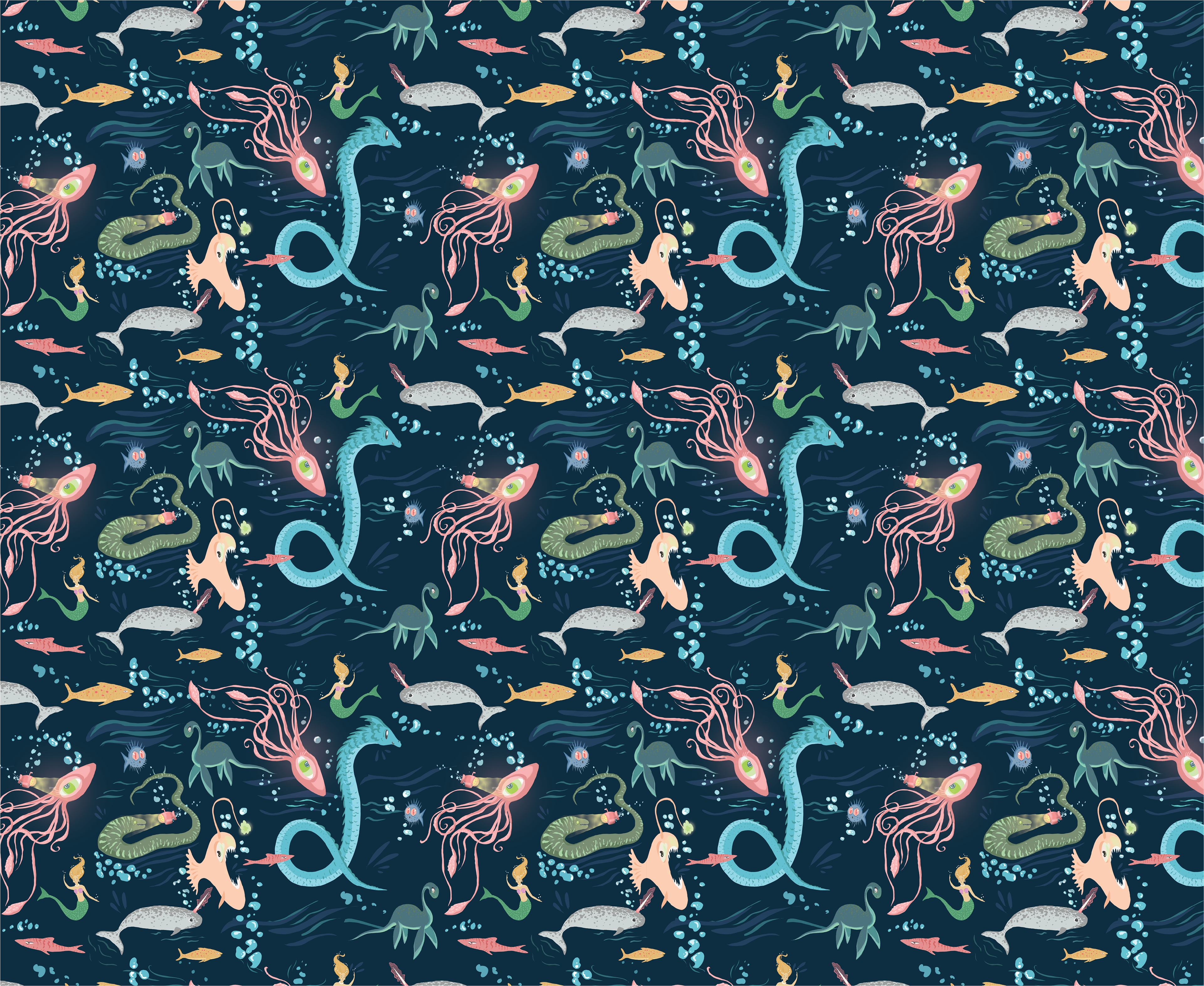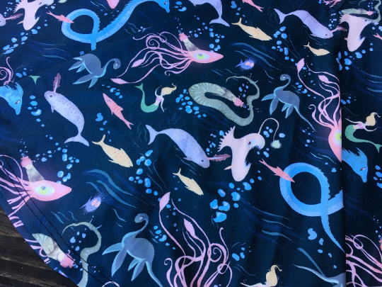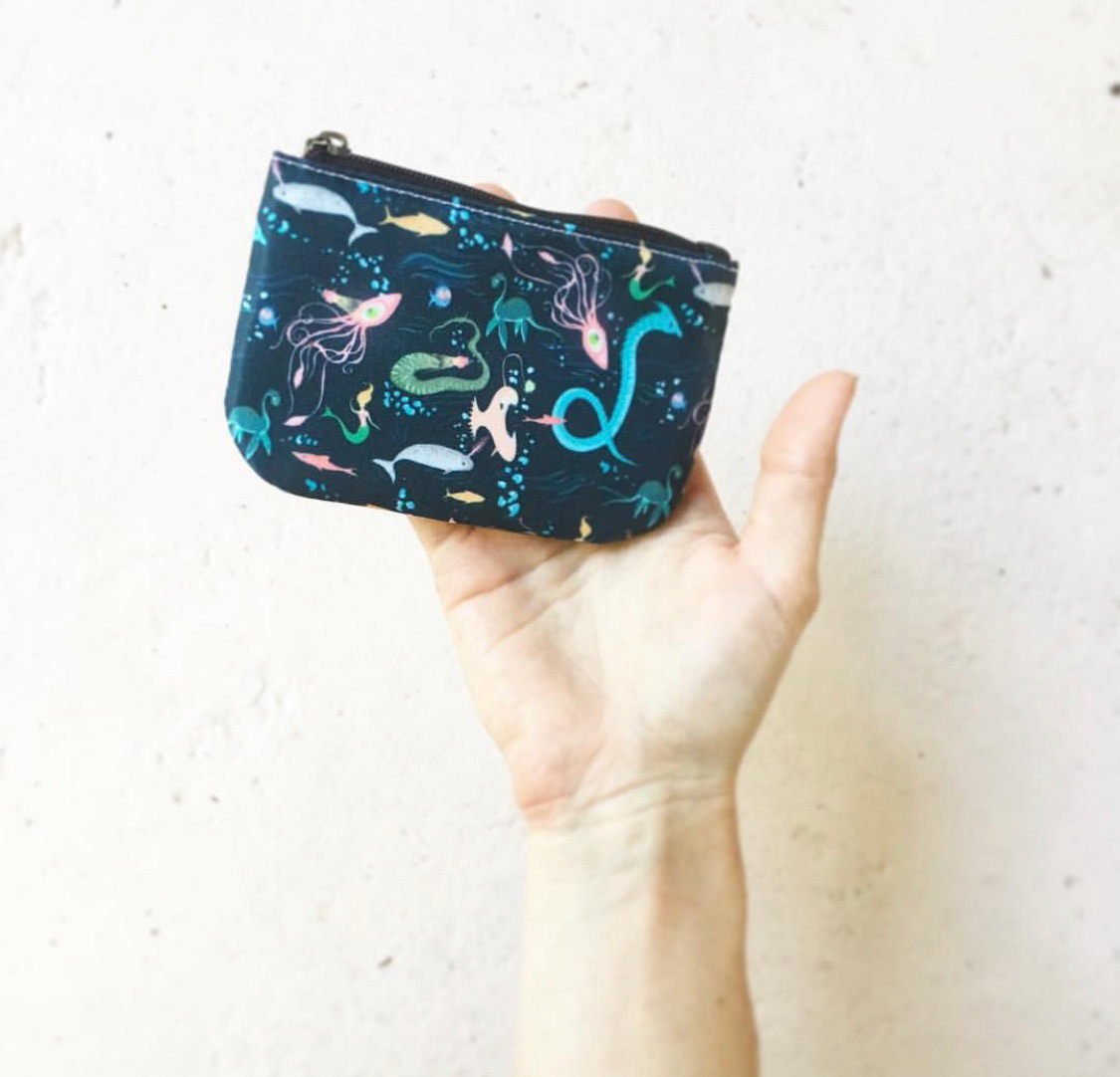 Mythical underwater sea creatures, mermaids, and narwhals. Printed onto small coin purse.